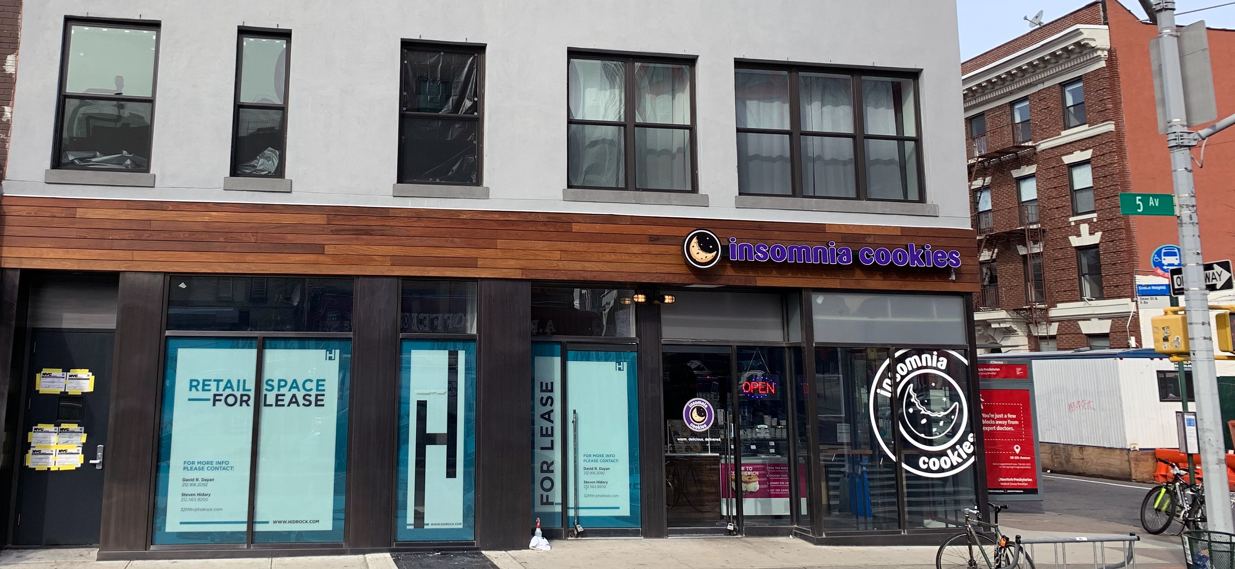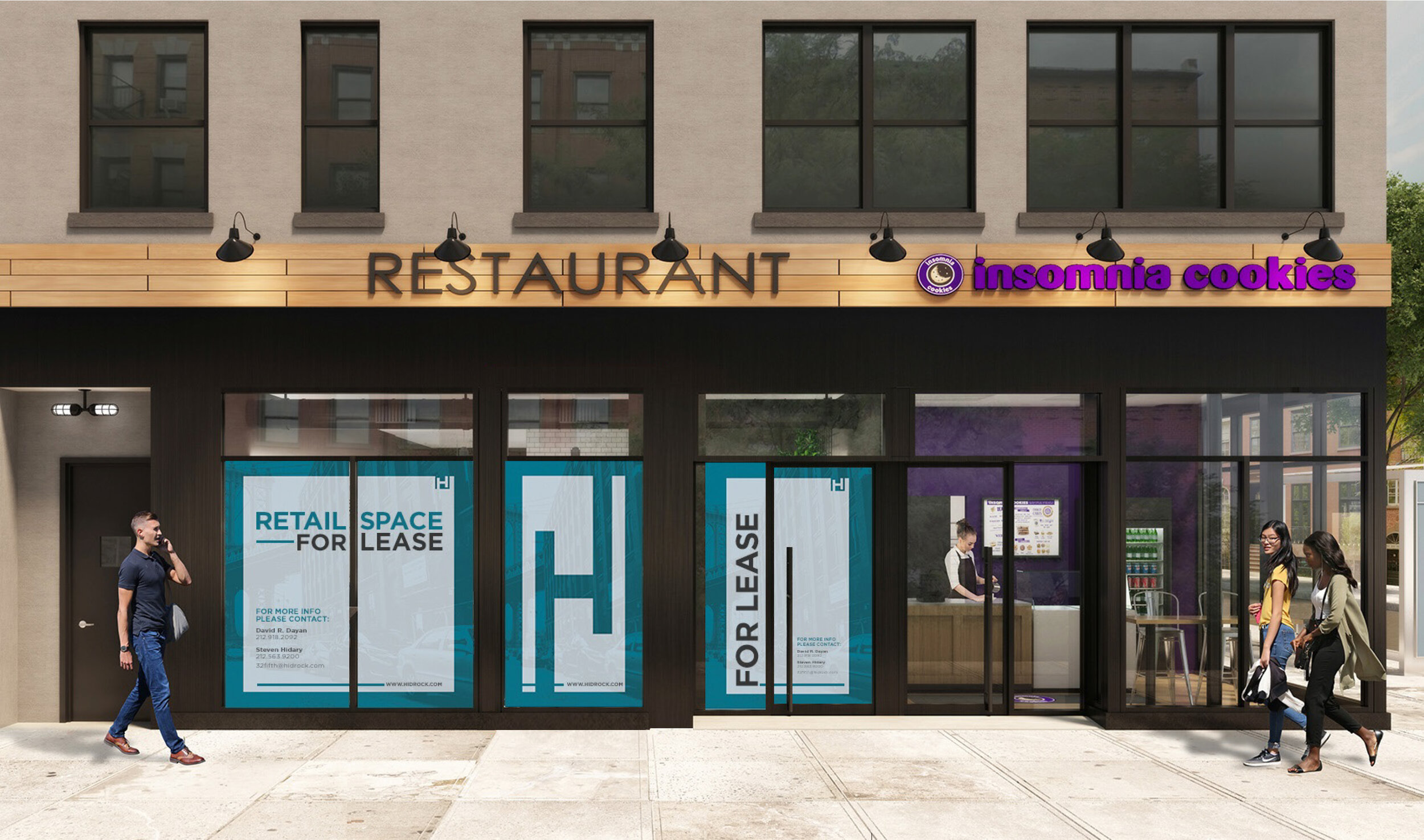 Rendering of a window wrap for Hidrock Properties' vacant retail space in Downtown Brooklyn. The design leveraged bold typography and striking visuals to attract potential tenants and showcase the space's prime location.