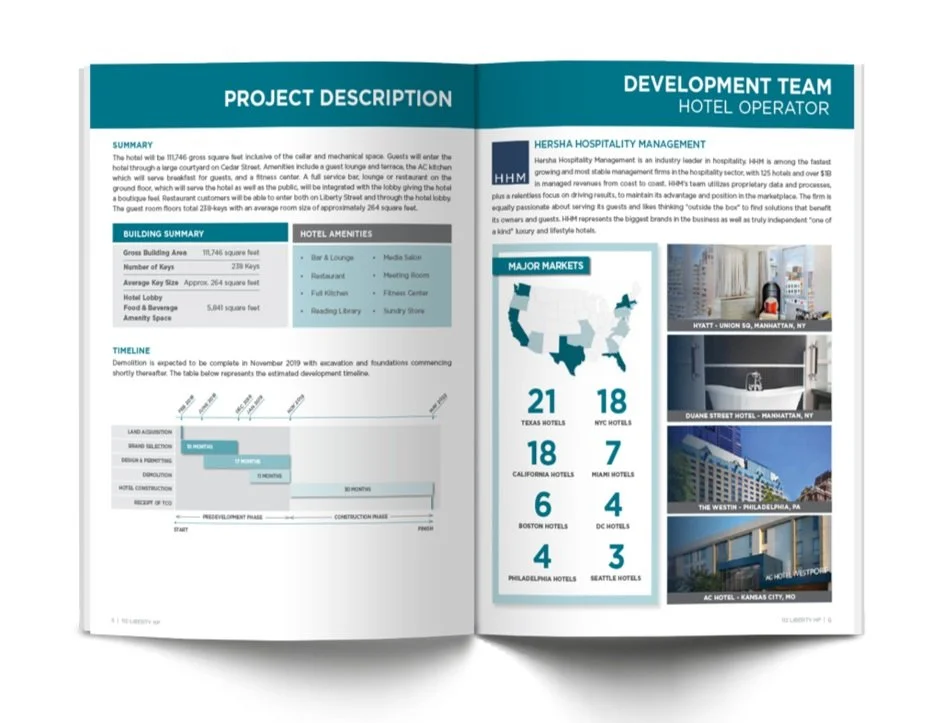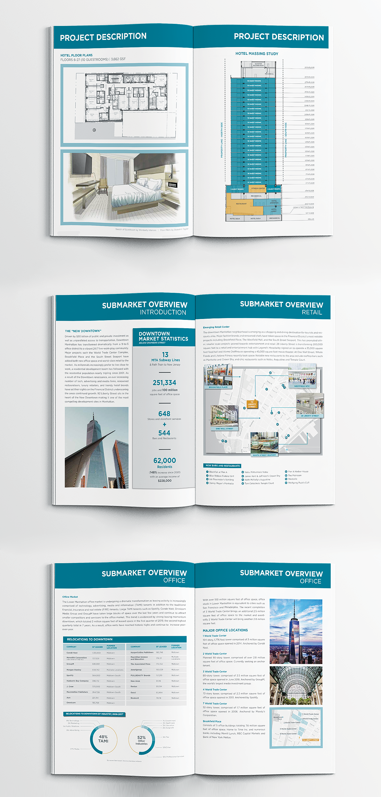 As a commercial real estate firm, you must find the finances to acquire property. In doing so, investment summaries are put together for current and potential investors. Shown here, is an Investor Presentation for a hotel property in downtown NYC. Heavy on infographics, maps and charts - a lot of my time was spent analyzing data and making sure the copy and design of infographics aligned with each other while still staying on brand aesthetically.