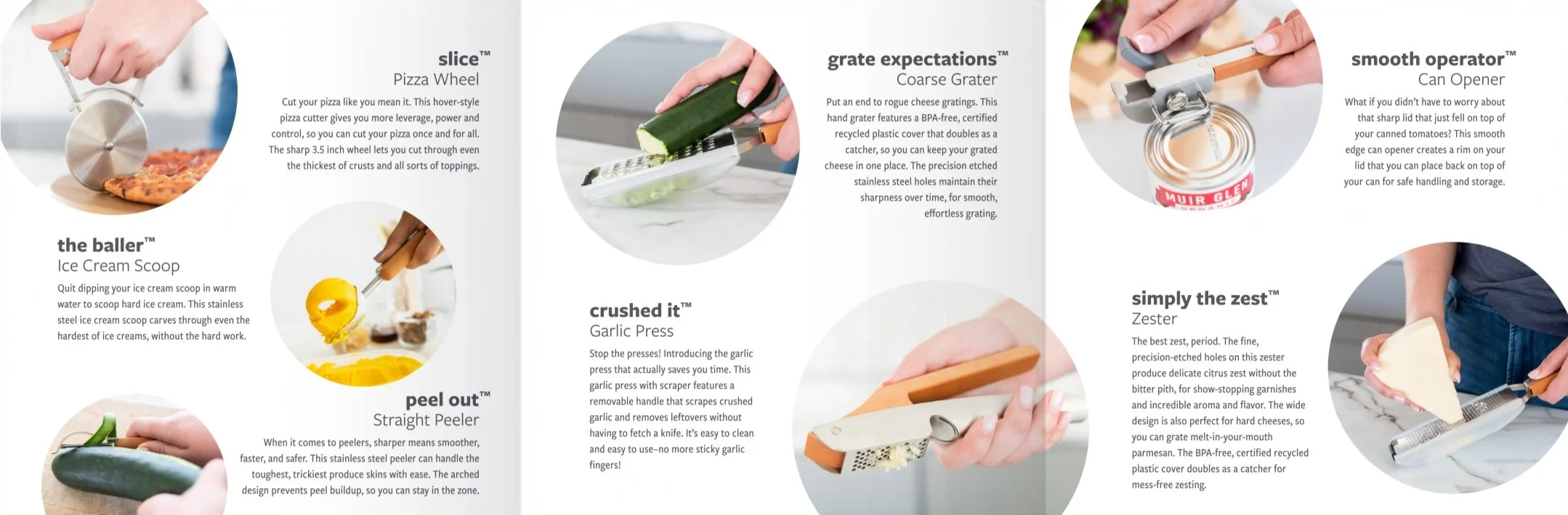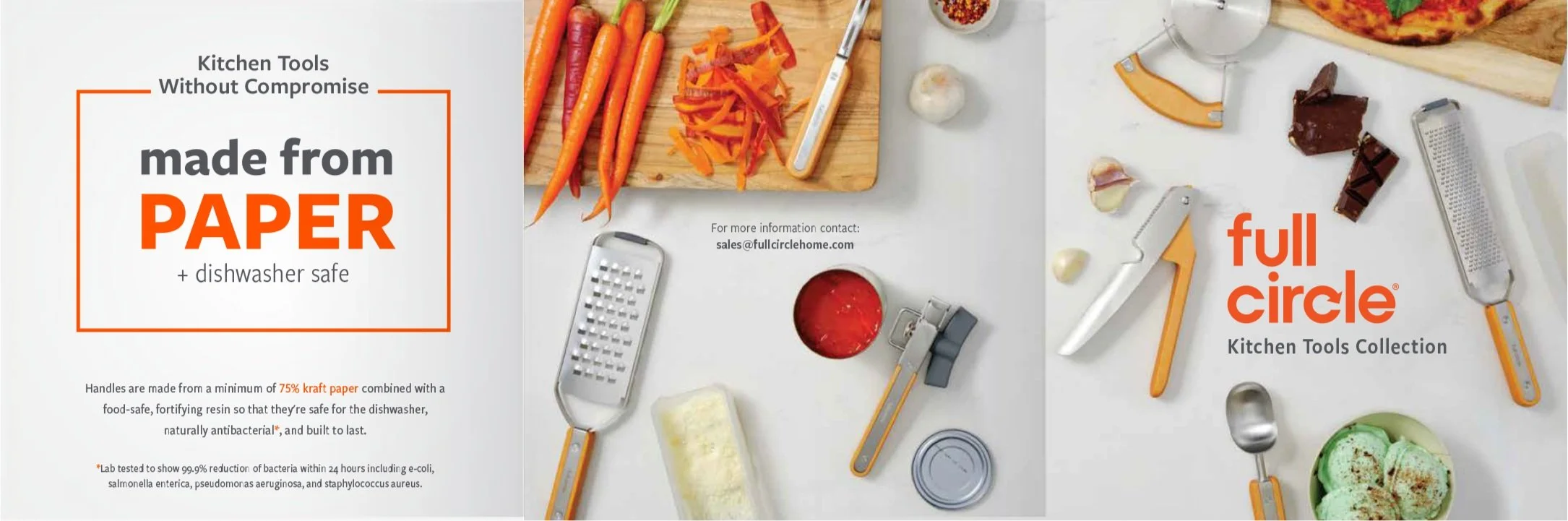 Project: New Collection Brochure // The Full Circle Home Gadgets Collection showcases innovative kitchen tools crafted with sustainable paper handles. This revolutionary material embodies the brand’s commitment to safe, eco-friendly home care products. This brochure not only promotes the products but also underscores their unique selling point: handles made from paper. By emphasizing sustainability, it aims to attract eco-conscious consumers and encourage deeper exploration of the collection.